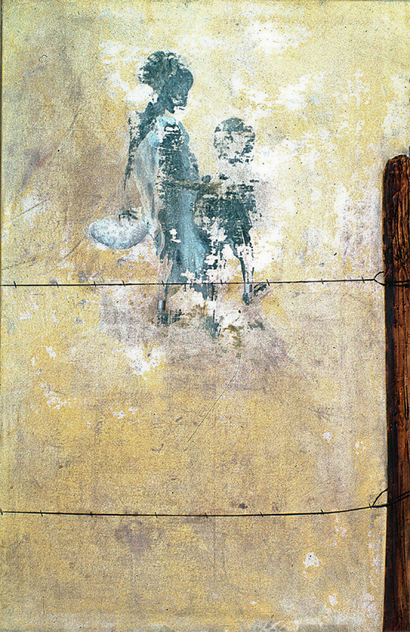 1996 FenceGuests V somalia – skin glue, tea, ness coffee, rust dust and fruit juice on nettle, 60 x 100 cm