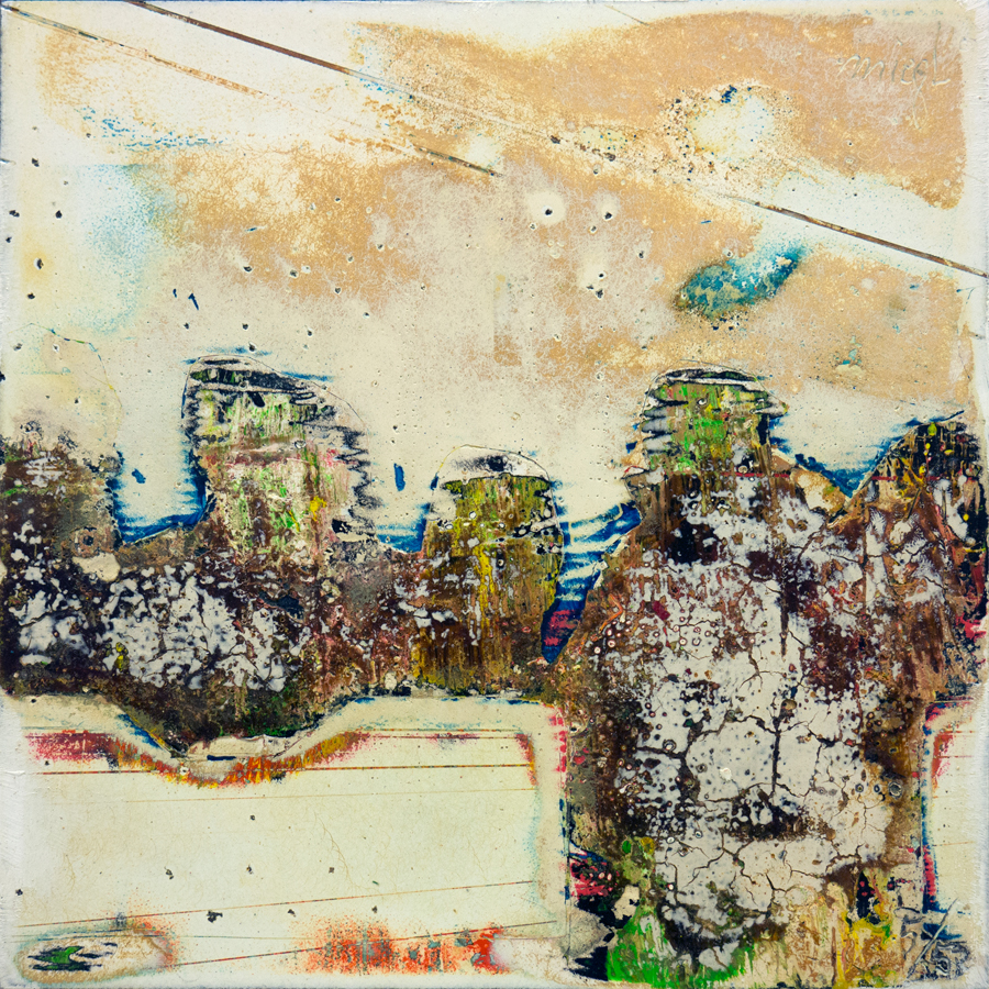 2016 FenceGuests XIII – acrylic edding etched feasting chalk oil and industrial paints on wood panel, 34 x 34 cm